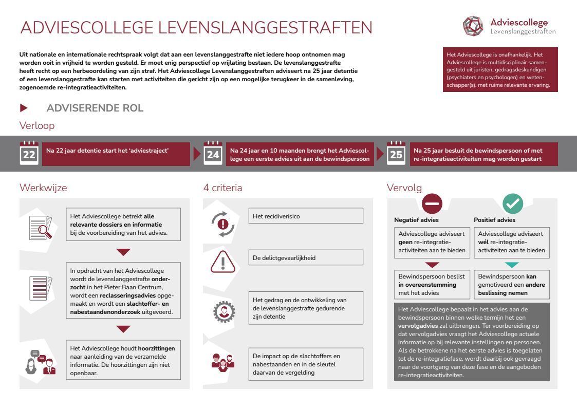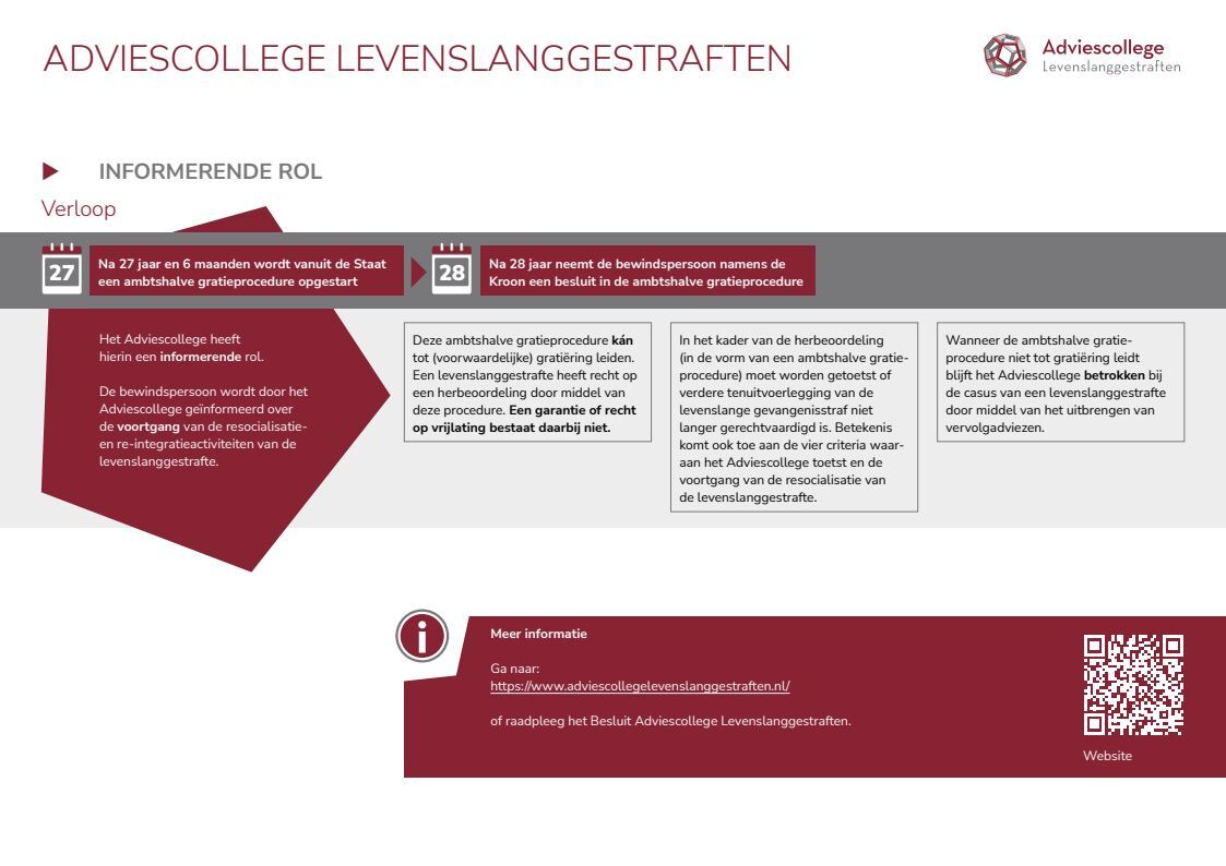 Bekijk de infographic voor een helder overzicht van het adviestraject dat na 22 jaar detentie wordt gestart en de informerende rol van het Adviescollege Levenslanggestraften tijdens de ambtshalve gratieprocedure.